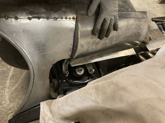 The fender back on the car, work on the fender to apron transition was commenced. It took some
