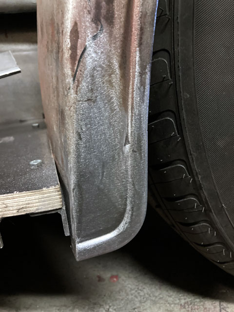 After the fenders were fully welded, they were again taken off the car, then some hammer and dolly work was done to them to smooth out most of the kinks and dents.
