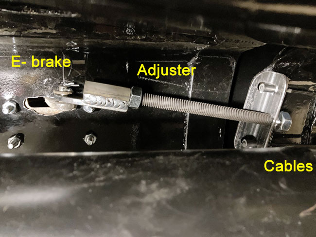 Seen from below here is the adjusting mechanism and the equalizer bar that theoretically will apply the same force on both cables when the hand brake is pulled. |