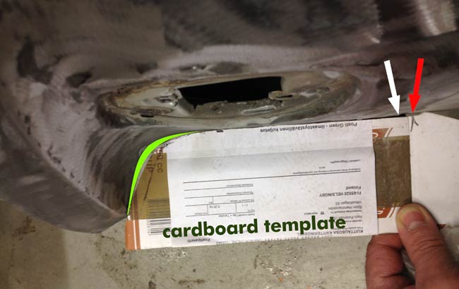 First some sheet metal pieces were welded to the outermost corner of the quarter, and pulled to the side. Not a success, since no matter how hard I hammered away with the heavy slide hammer, nothing gave. In the end I gave up, and cut up the whole thing as the pic on the left shows. Then a template was made, using the right hand side as a model, and a new strip was cut and welded it. After a few spot welds the fit was checked, and as all looked good, the rest was welded and ground. Now it looked good, and I called it a night. |
