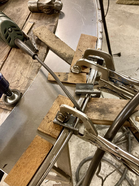 We noticed that when the front of the fender is moved, the whole thing shifts. This me ans that the running boards have to be mounted and the aprons ready to fit the fenders, or we could be working indefinitely and still not get the fenders to look the same.