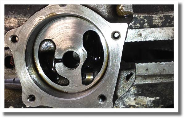 The innards of the oil pump looks about as worn and ground as one would expect, considering the sludge in the bottom of the crank case. |