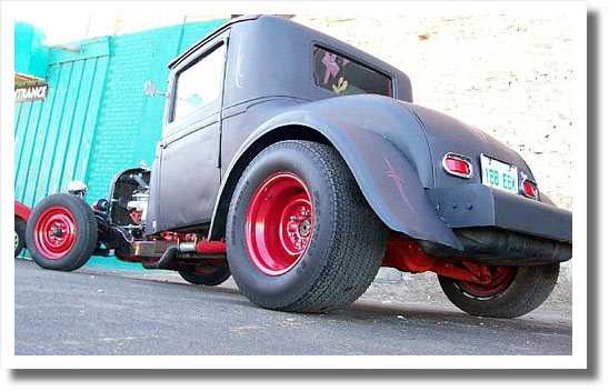 Front rims are 1955 Chev 15" x 5" powder coated red with 165 R 15 tires