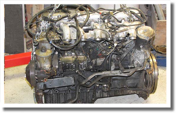 The Mercedes engine was hoisted out of a 1991 Mercedes-Benz 300 D. |