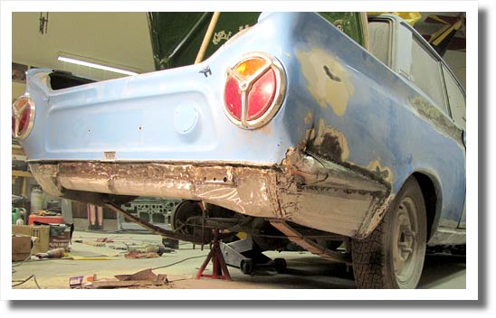 The rear valance is looking better now, and the fuel tank filler hole has been welded shut. |