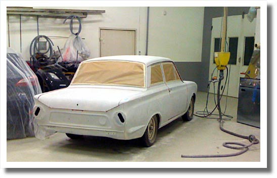 A buddy helped mounting the doors, trunk lid and hood, and towed the Cortina to the bodyshop with his Ford Transit. |