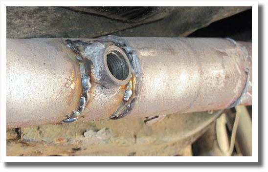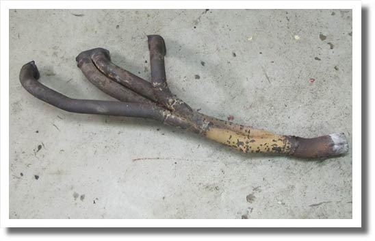 The exhaust header looks sad to say the least. What's worse is the way the collector pipe is welded to the exhaust joint. A hole burned with a mig welder, and there's a huge drollop of material inside the pipe. |